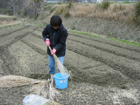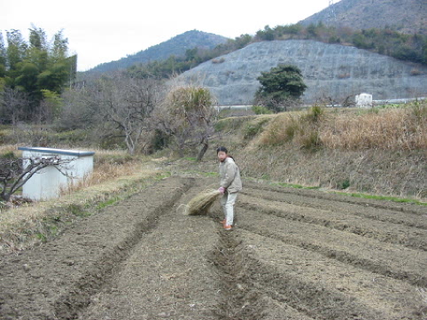 2月8日 紫黒米を作っている田んぼ(1畝反)に菜の花の種をまきました。ささやかな田んぼですが、菜の花農法にチャレンジです。秋の終わりに、モミガラを山のように入れ、米ぬかを約150キロ散布して、耕起しました。